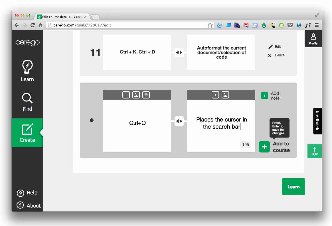 The interesting thing about Cerego is that it has already social features build-in (a must). That means you can find courses created by others