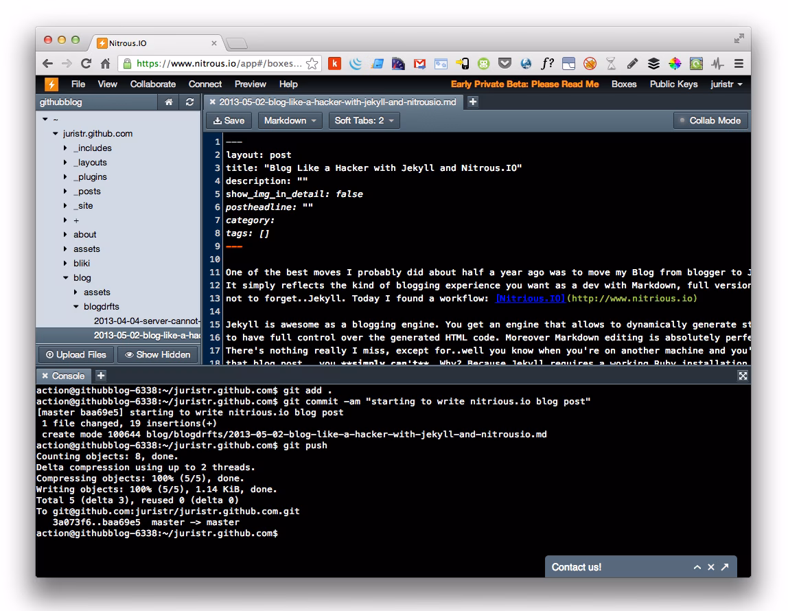 One of the best moves I probably did about half a year ago was to move my Blog from blogger to Jekyll, hosted on GitHub. It simply reflects the kind of blogging experience you want as a dev, with Markdown support, full version control and amazing hosting on GitHub plus - not to forget - Jekyll. What I was missing so far, however, was the ability to blog from any computer or even tablet. Today I found a possible workflow: Nitrous.IO