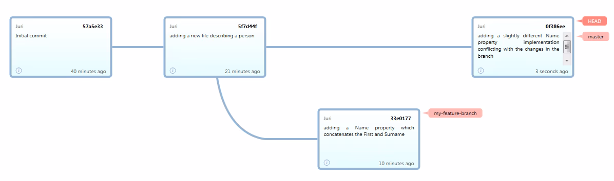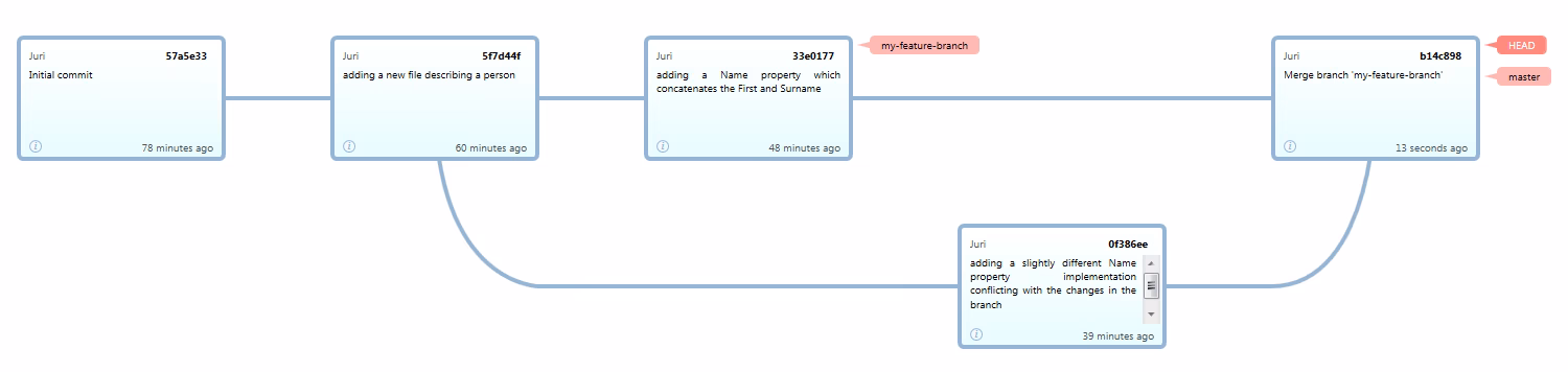 What I’d like to demonstrate in this section is on how to resolve a merge conflict. For that to work, we need to create another commit on master that conflicts with changes on my-feature-branch. As such, let’s modify Person.cs accordingly.