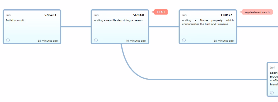 After committing the changes, the tree has advanced and note that now master and my-feature-branch point to different locations. HEAD is on our feature branch as it is the current active one.