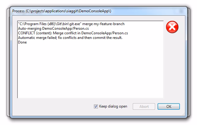 As expected, fast-forwarding fails and we get a merge conflict notification