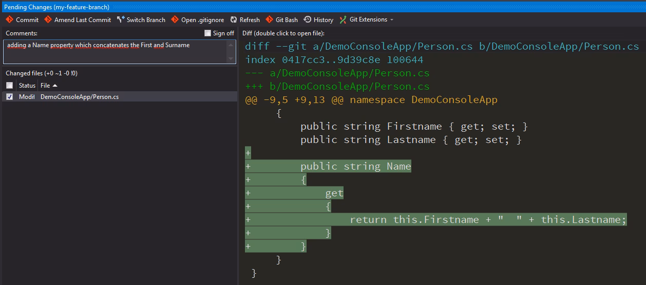 We can now modify an existing file - say our Person.cs - and commit it. The Pending Changes window exactly shows the diff of the changes before we commit them