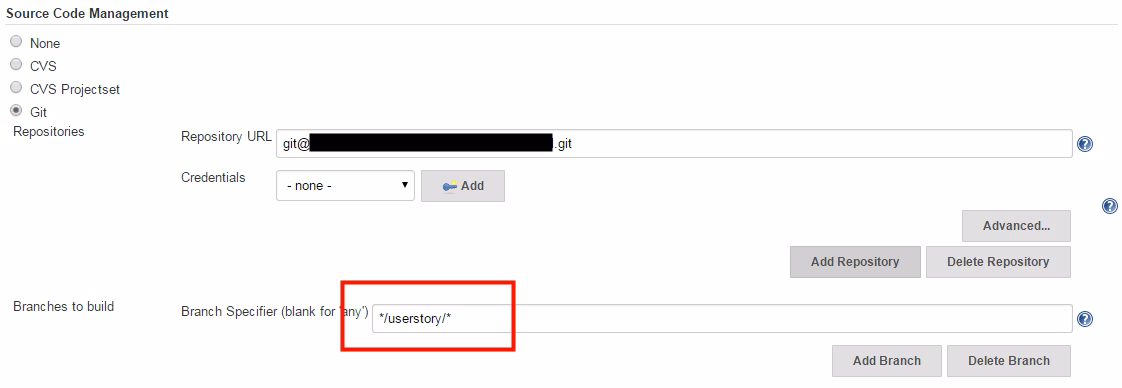 In the Branch Specifier field, enter your desired branch, depending on which one you’re going to build in this current job. For master simply enter */master, for building your feature/userstory branches (and given you start them with story/<name>), enter */story/* and so on.