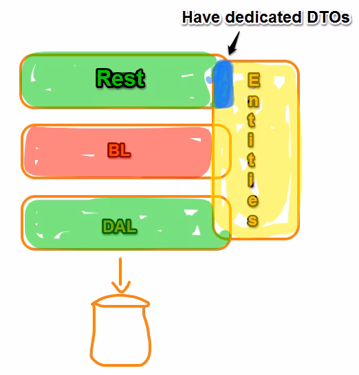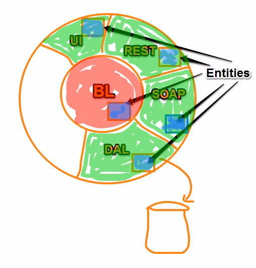Take for instance what happens if you change the database table?? You need to change the entities, which impacts on your data access layer (probably), your business layer and even your frontend layer where you (most probably) directly use the domain objects for the UI logic. I experienced these problems by myself when we switched to creating rich client JavaScript apps with a REST layer at the backend. Our initial “naive” approach to expose the the Entity Framework entities directly to the JavaScript client isn’t so ideal in the end. So we ended up with some DTOs on the REST interface side which decouples it from changes on the domain entities.