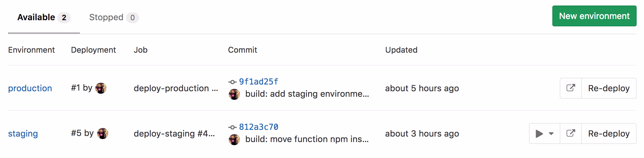 GitLab also nicely keeps track which commit has been deployed to which environment, also showing the play button here as well, which allows us to promote a given build from staging into production.