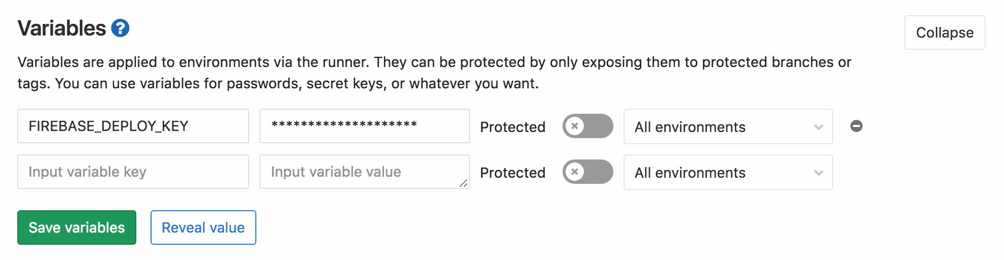 The $FIREBASE_TOKEN needs to be registered on your GitLab repository’s Settings > CI/CD Settings > Secret variables.