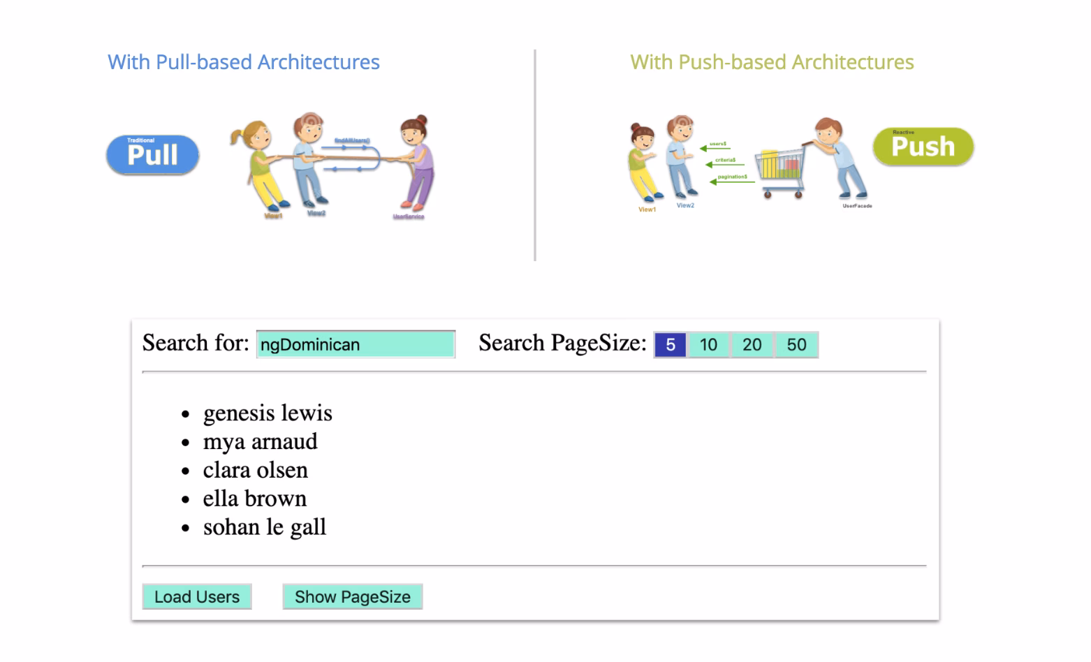 In a traditional pull-based approach, you would click the button, in the click handler, invoke a function on your service passing the new pagination value, get back a stream and re-bind it to your list. Moreover, think about what this opens up for you. If your server is able to handle websockets or server sent events, you can actively even push down new data as other users change them.