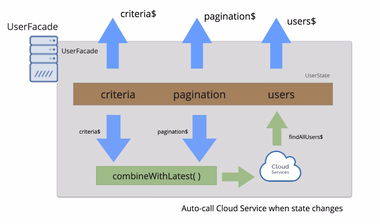 Since streams come into the service as well as go outwards, they can also be consumed and combined nternally to the UserFacade. That is, we can subscribe to the criteria$ and pagination$ and whenever either of the two changes, the backend can be invoked automatically and streamed back into the findAllUsers$ stream. That’s push-based at work :smiley: