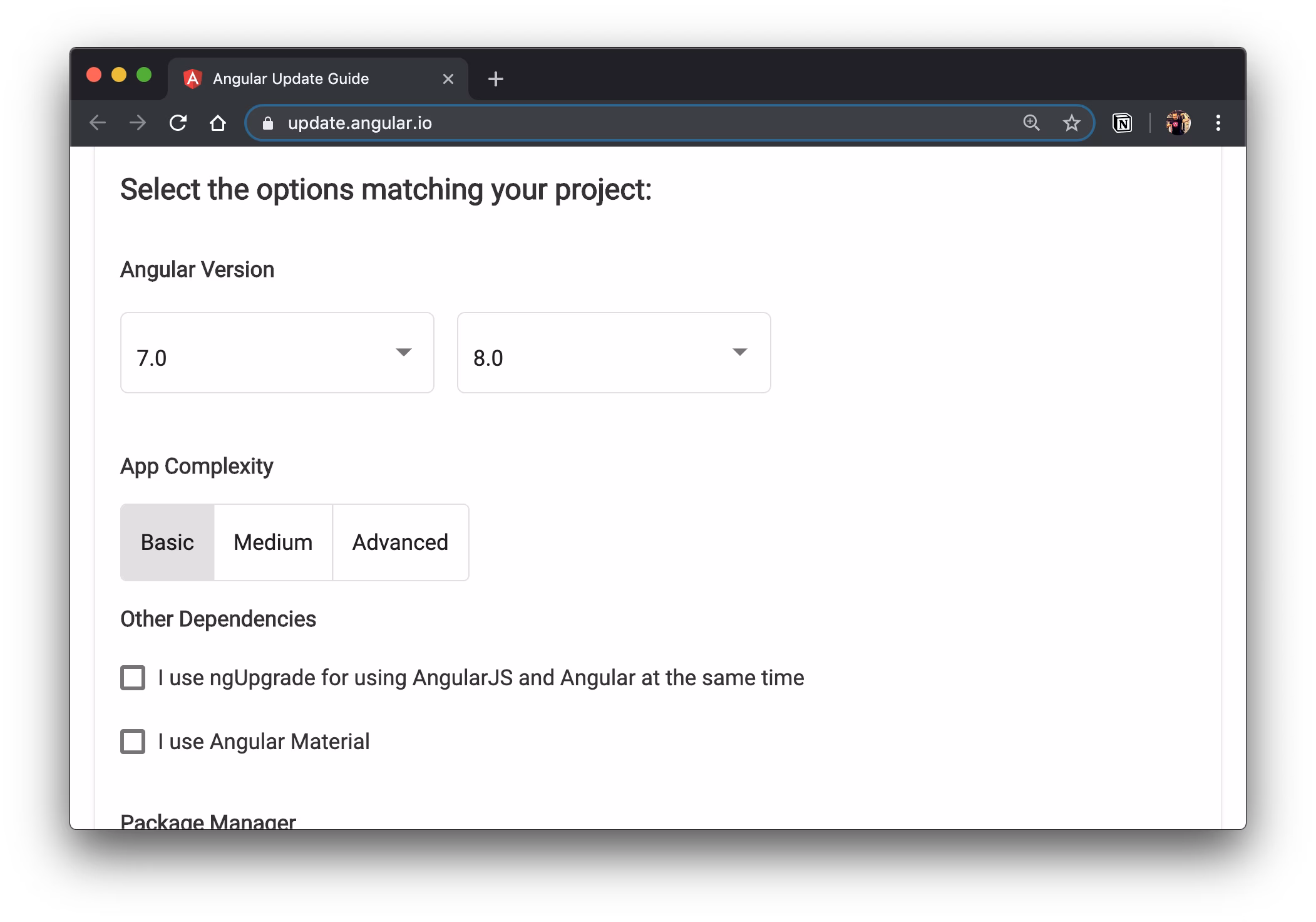 The site allows you to choose the start and target version and then gives you a set of instructions on how to update your codebase.