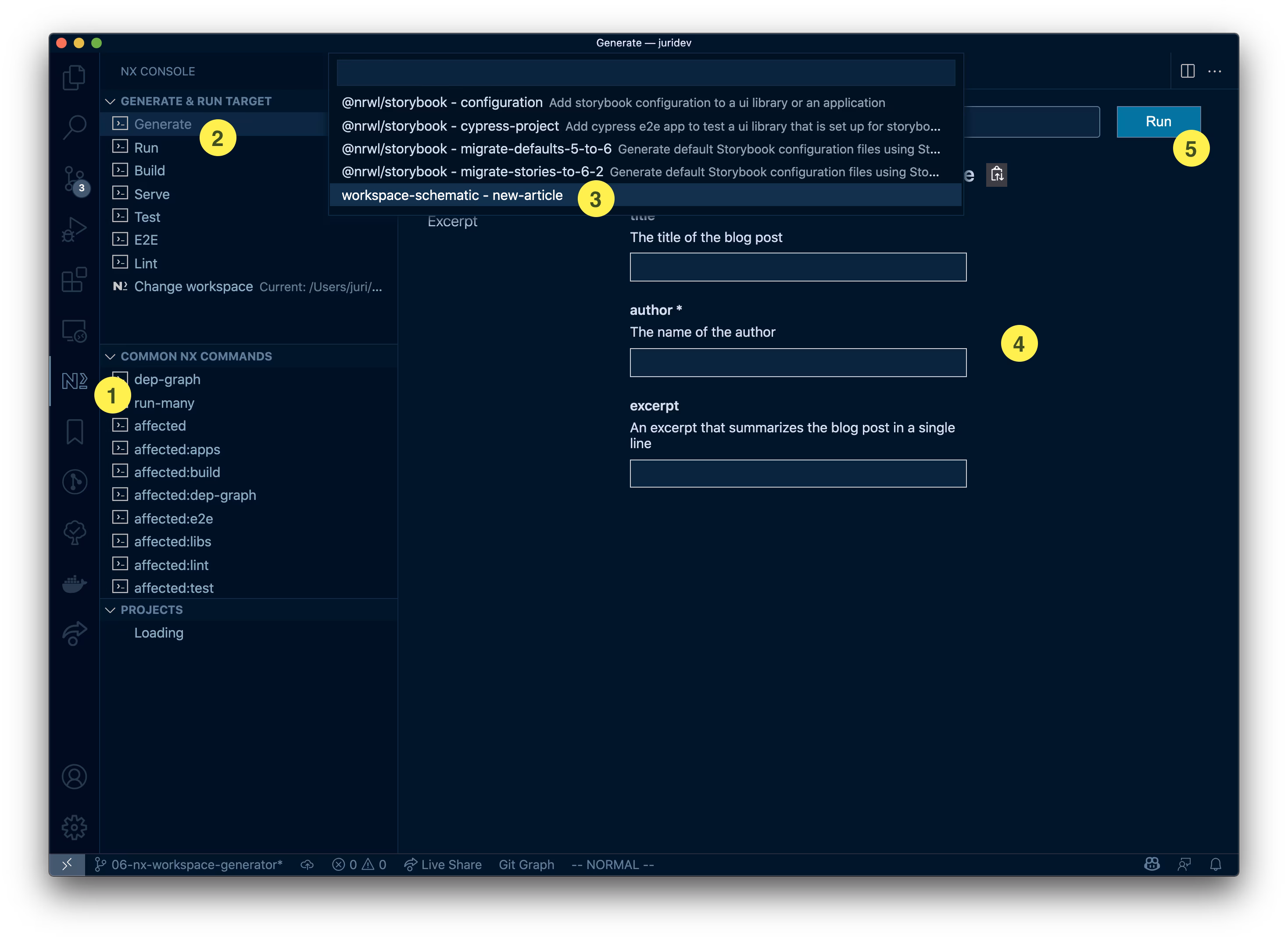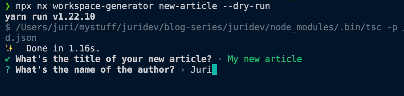 npx nx workspace-generator new-article "my generated article" --author=juri --dry-run
