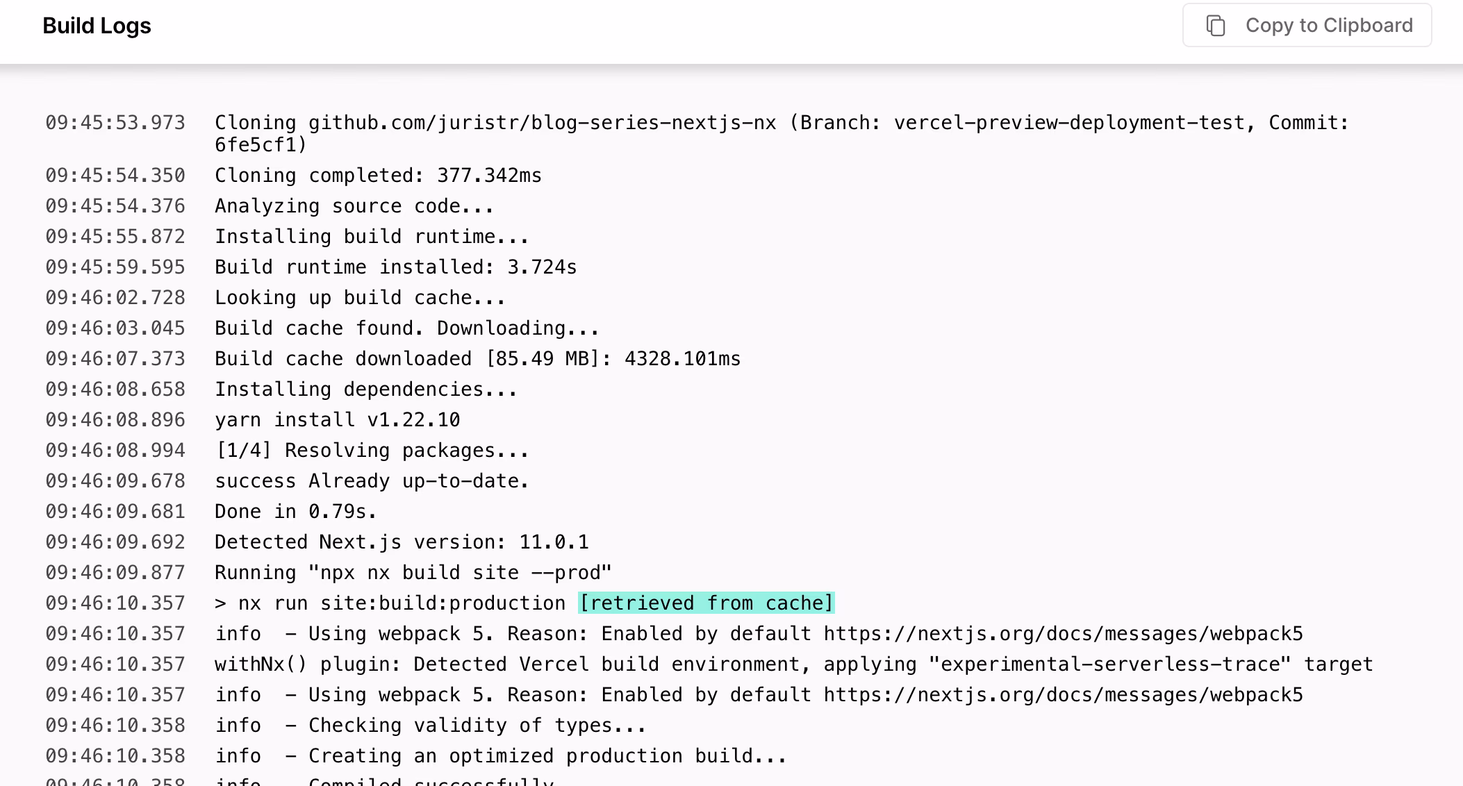 Inspecting the deployment logs, you might see something like “[retrieved from cache]”.