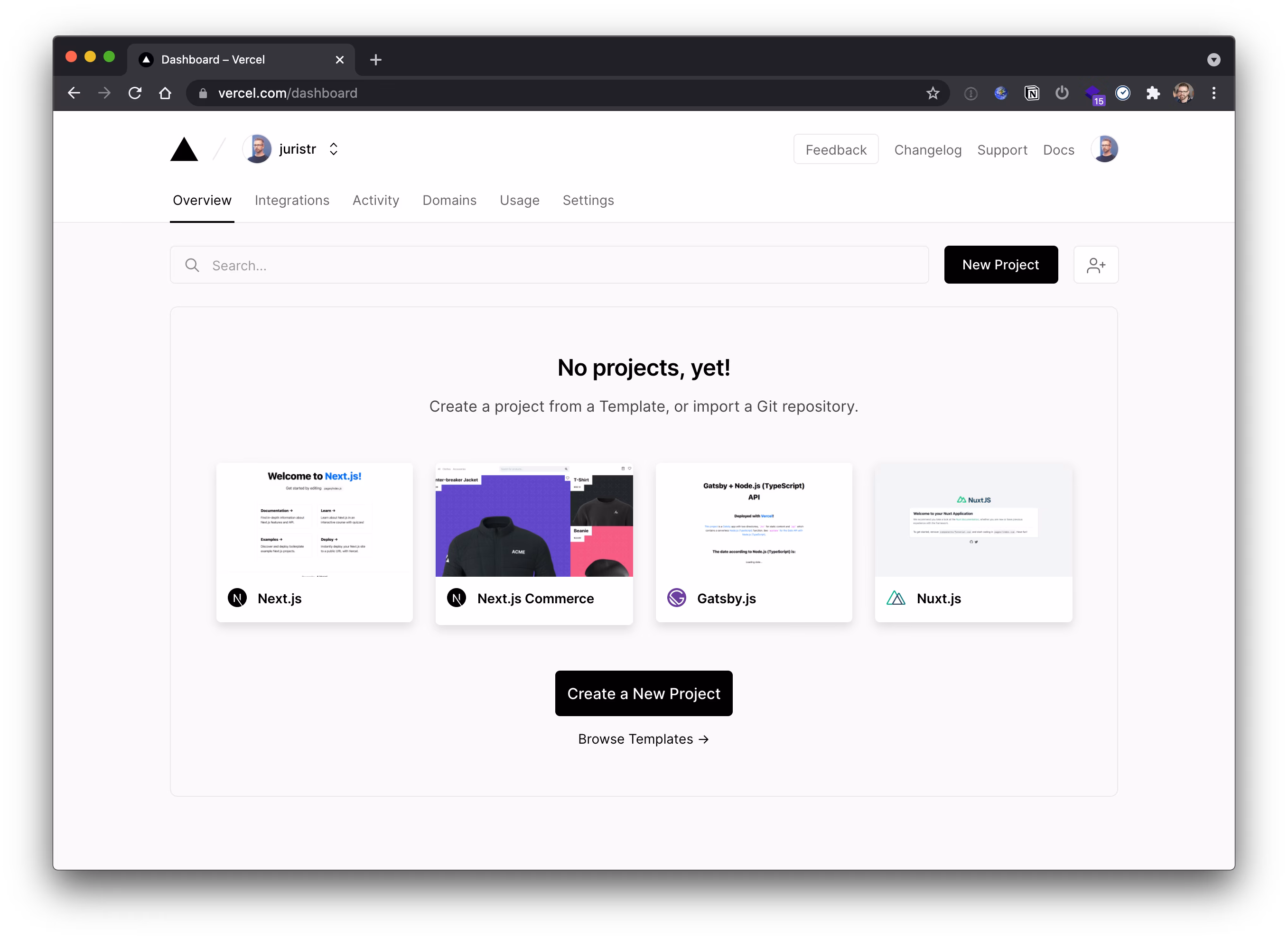 To set up our deployments on Vercel, first go to https://vercel.com/, create an account or log into your existing one. Since we already have our Next.js project setup with Nx, we choose “Create a New Project”.