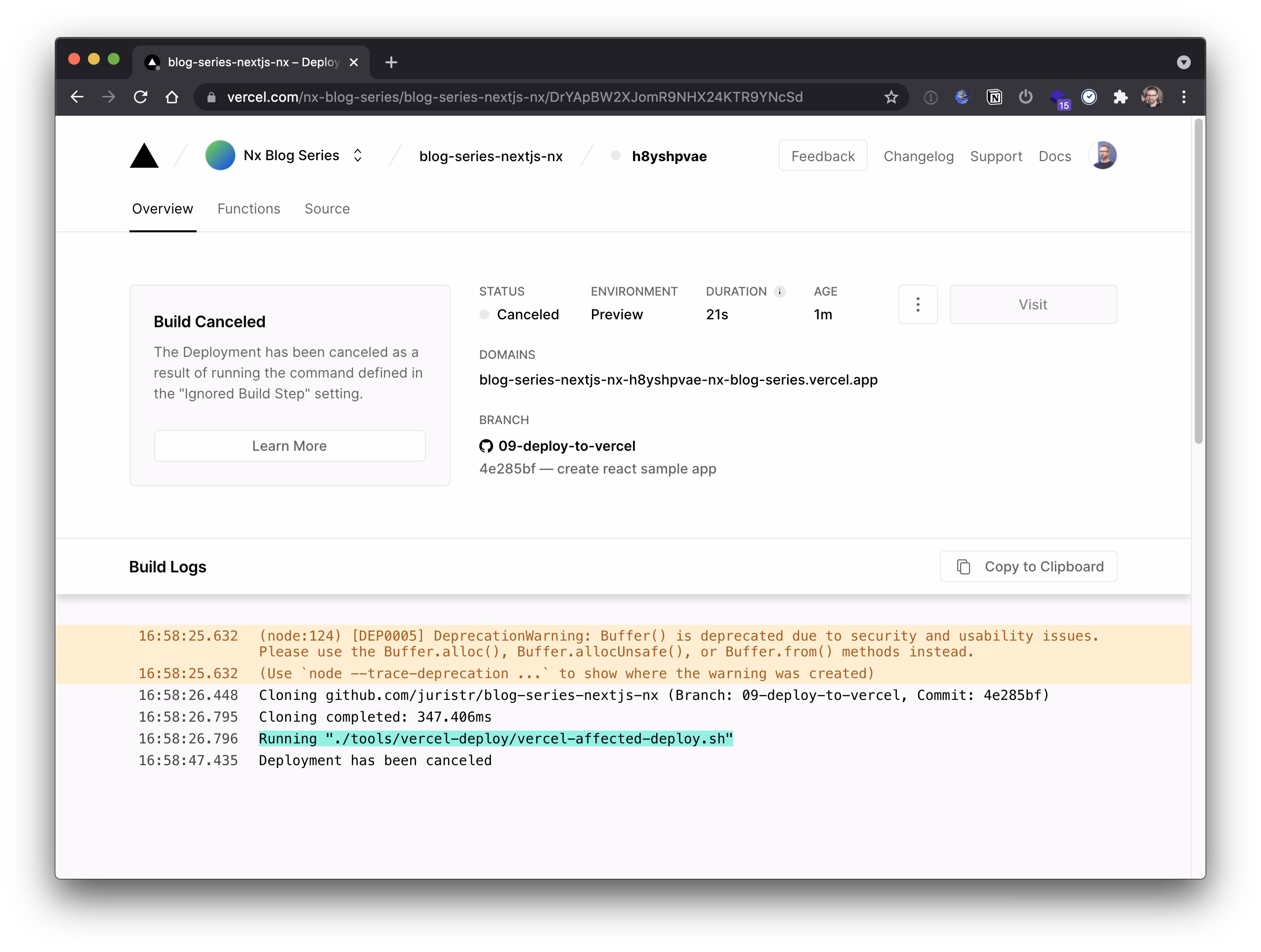 When the build is triggered on Vercel, you should now see that the vercel-affected-deploy.sh has been used.