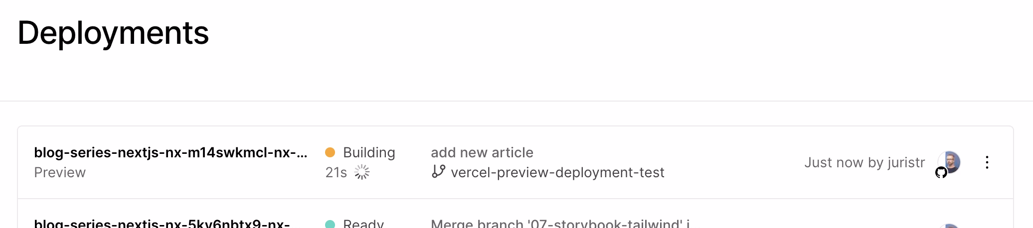 If you go to the /deployments page on your Vercel project, in my case https://vercel.com/nx-blog-series/blog-series-nextjs-nx/deployments, you should already see a deployment running which is marked as “Preview”: