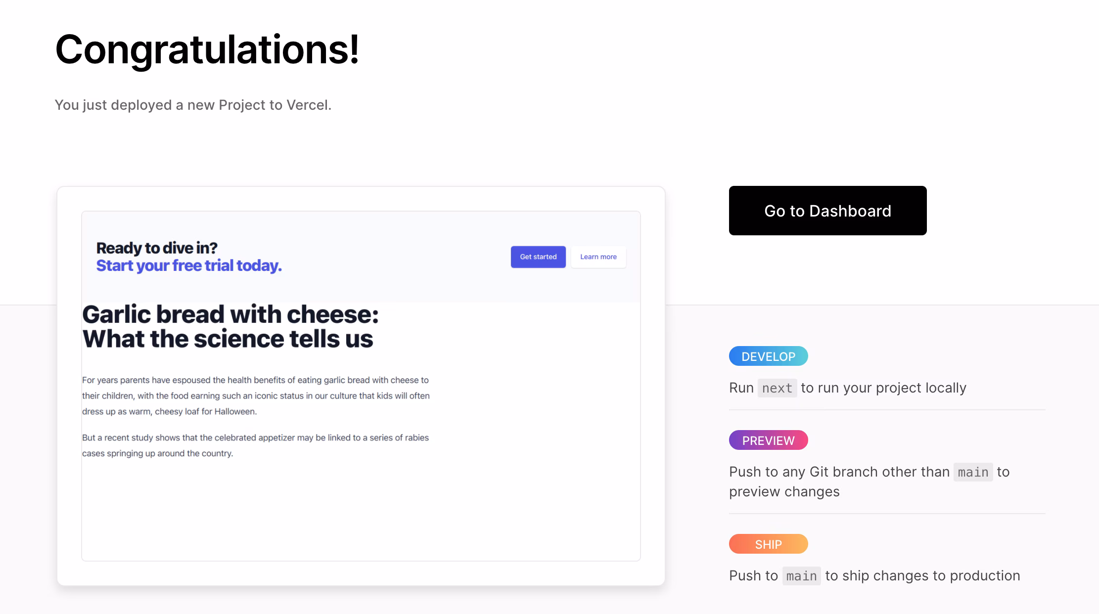 We just deployed to production. As we described earlier, Vercel has another cool feature that comes in really handy: Preview Deployments.